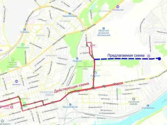 Теперь она выглядит таким образом: поселок Александровка – Берберовская – Вересаева – проспект 40-летия Победы – Сарьяна – 35-я Линия – Комсомольская – Свободы – площадь К. Маркса – 1-я Майская – Верхненольная – Советская – Театральный – Красноармейская – Привокзальная – Главный автовокзал – Привокзальная – Красноармейская – Театральный – Советская – К. Маркса – 19-я Линия – Мясникова – Сарьяна – 40-летия Победы – разворот в районе 40-летия Победы, 202 – 40-летия Победы – Вересаева – Берберовская – поселок Александровка.