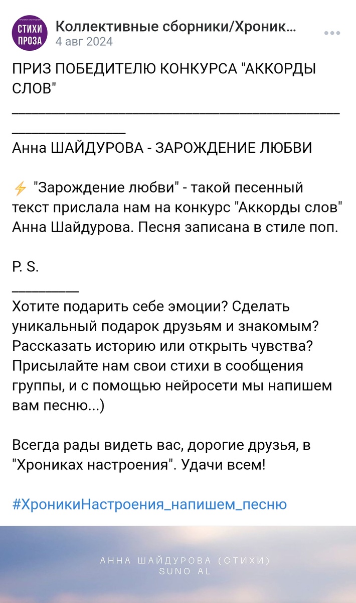 Ну а потом с этой песней (текстом) я участвовала в конкурсе там же в ВК, где призом была запись песни при помощи нейросети.