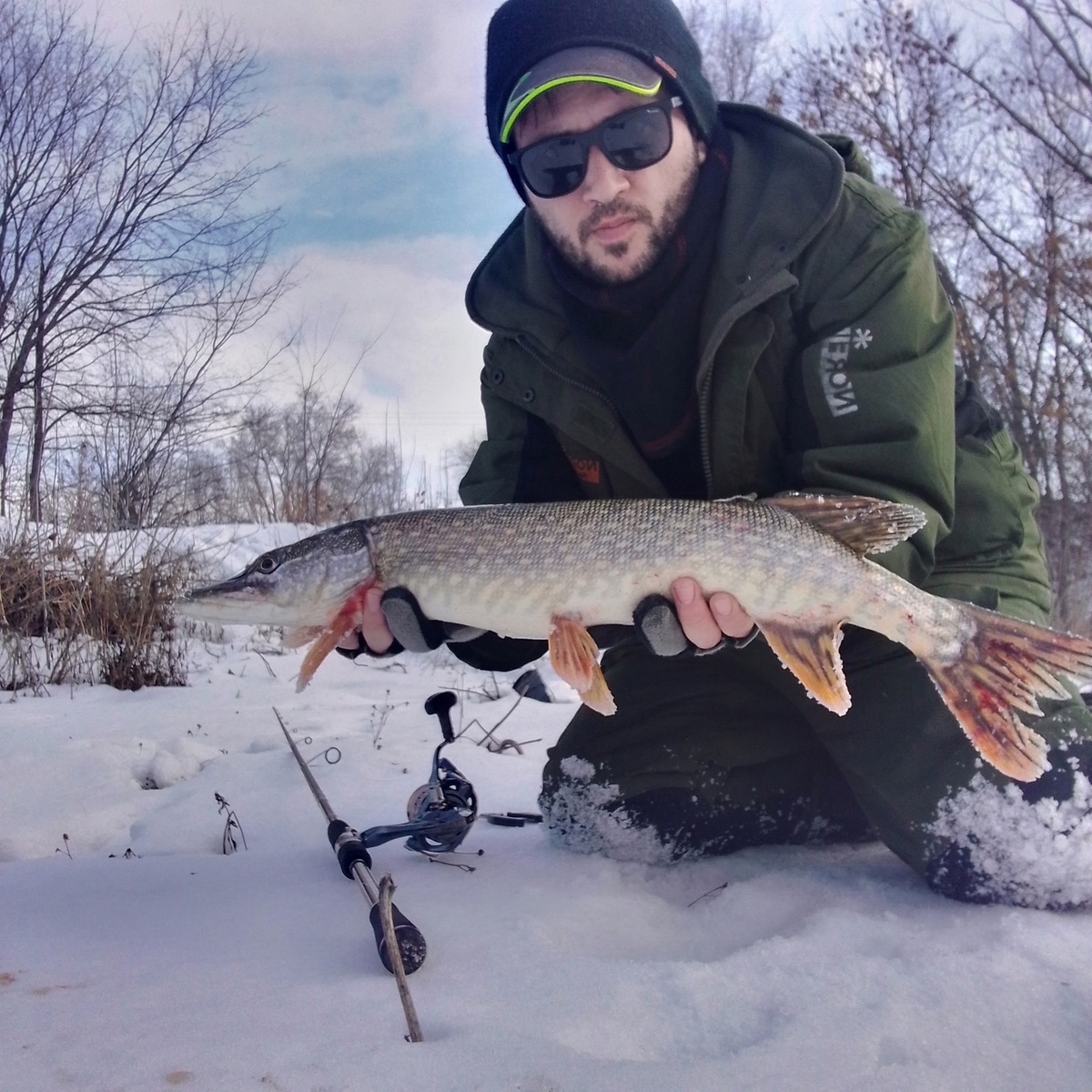 В одну из прошлых поездок на данном участке было несколько холостых поклёвок, и я решил впервые за этот зимний сезон взять другой спиннинг, тем более что в прошлый раз рыба тут была исключительно джиговая, а значит, как я думал, лучше подошел бы Norstream Kando-X Jig 902MHH (12–52 г). У него и с забросом всё будет прекрасно, да и подсечка станет более уверенной и результативной. Если, конечно, мне удастся убедить кого-то из хищников уделить мне чуточку внимания. Первое, что я увидел, когда оказался на открытом участке, — это всплеск на самой поверхности воды. Жерех? В январе?! Да ладно, всякое бывает. Но нет! Через несколько минут безрезультатного полоскания поролоновой рыбки активность в верхних слоях воды повторилась. Ах так! Вообще, я противник того, чтобы спиннингом такой длины ловить на воблер, но ситуация заставляла переступить через собственные принципы. Хрясь! Вот и первая — и весьма приятная! — щучка красуется перед камерой моего телефона. Но... воблеры? Решил вернуться к д