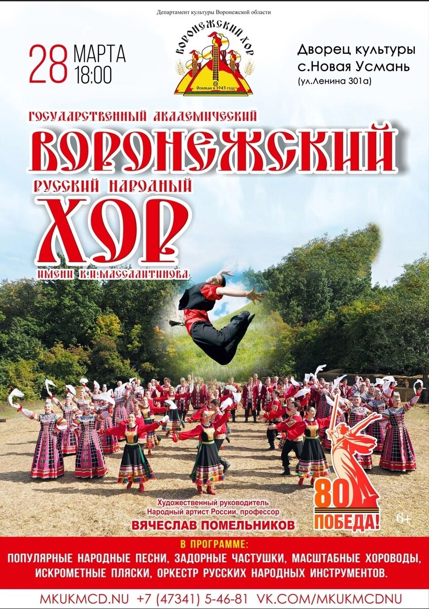 Уважаемые друзья! К вашему вниманию предлагается незабываемое событие. 28 марта в 18:00 в Дворце культуры села Новая Усмань состоится концертная программа «Наш край, Россия!», посвященная 80-летию Великой Победы. Главным действующим лицом этого концерта станет Государственный академический Воронежский русский народный хор имени К.И. Массалитинова, который признан одним из лучших народных коллективов мирового уровня.