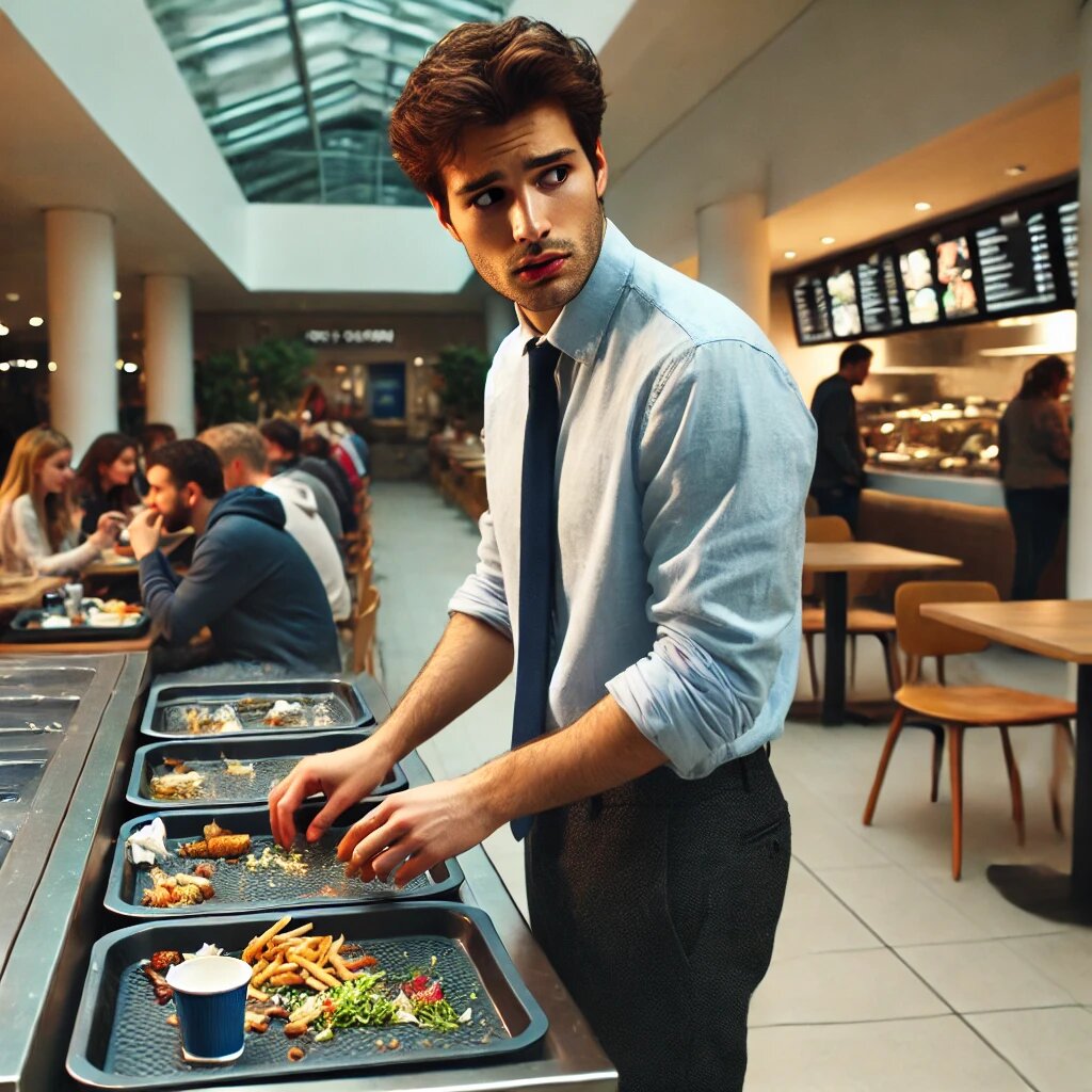Даша сидела за столиком на фудкорте гипермаркета, доедая картошку фри. Она наслаждалась моментом, хотя вокруг всё кипело — вечерний поток покупателей, разговоры, капризничающие дети, а кто-то за соседним столиком громко обсуждал скидки на бытовую технику. Но её взгляд случайно зацепился за одного парня у стойки для грязных подносов. Он был молодой, прилично одетый, но явно чувствовал себя не в своей тарелке.