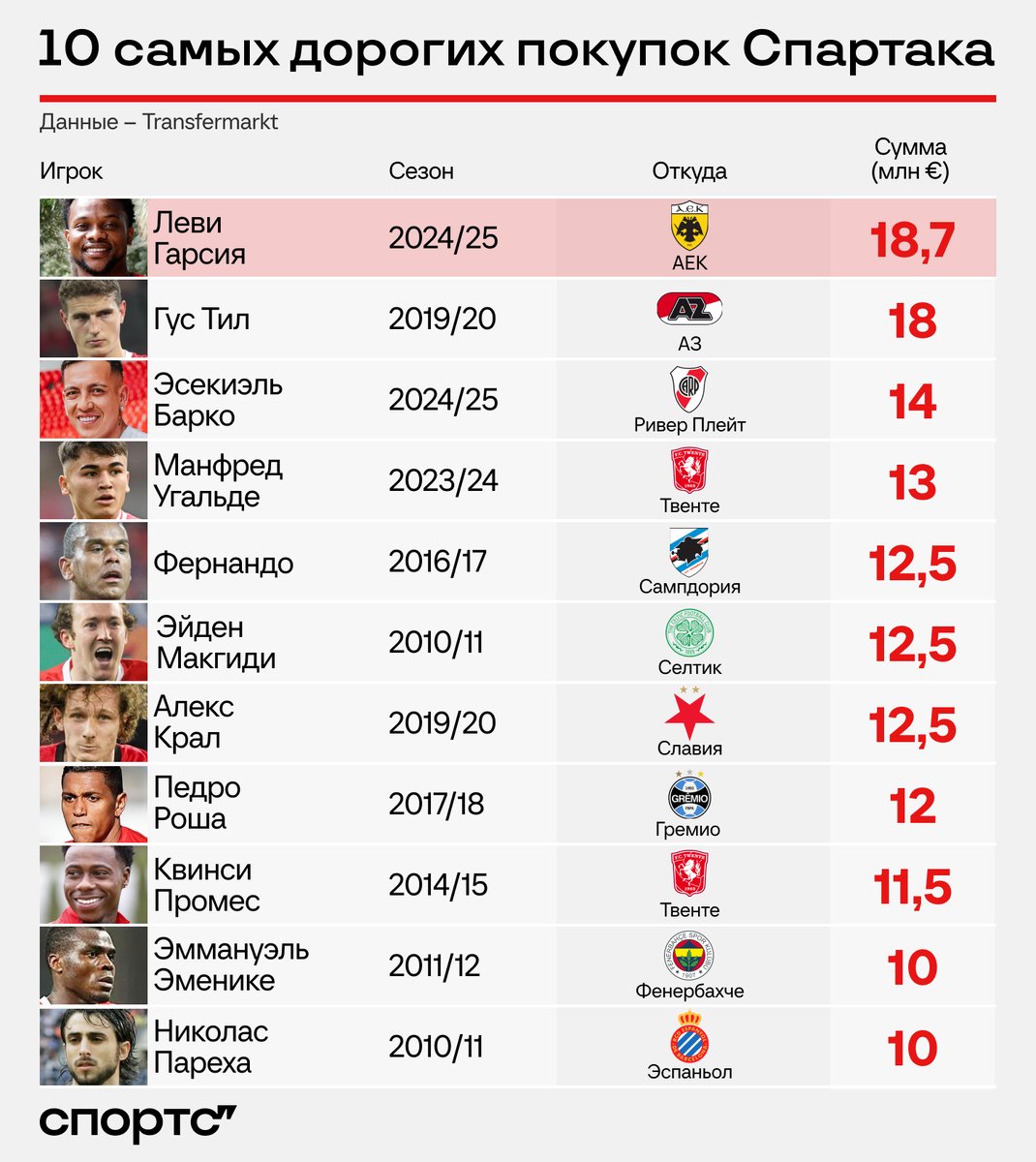 Одна картинка. «Спартак» объявил о подписании 27-летнего Леви Гарсии из греческого АЕК. По данным трансфермаркта, это покупка за 18,7 млн евро – самая дорогая в истории клуба. Вот так теперь выглядит рейтинг. ● Гарсия мог стоить и до 20 млн евро – некоторые инсайдеры дают такие данные. Возможно, разница в бонусах для АЕК за результаты команды или лично игрока. Тогда отрыв от Гуса Тила станет еще внушительнее. ● За этот сезон – сразу две новых строчки в топ-3 рейтинга. Эсекиэль Барко быстро стал одним из лидеров команды, во многом с ним связаны приятные впечатления об осеннем «Спартаке» и победная серия перед зимней паузой, благодаря которой мы сейчас считаем «Спартак» претендентом на чемпионство. ● Трансферная стоимость Гарсии – 15 млн евро согласно трансфермаркту. Так что если «Спартак» и переплатил – ненамного относительного этого ориентира. ● В сезоне-2024/25, по сумме лета и зимы, «Спартак» потратил уже 47,1 млн евро. И это при том, что еще возможен приход за 20 миллионов серба Ива