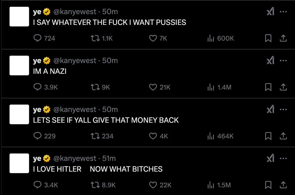 Ментально нездоровый рэпер Канье Уэст разразился безумной тирадой в X, опубликовав серию постов с расистскими, сексистскими и антисемитскими высказываниями. Возможно, когда он придет в себя, то будет писать, что его аккаунт взломали.