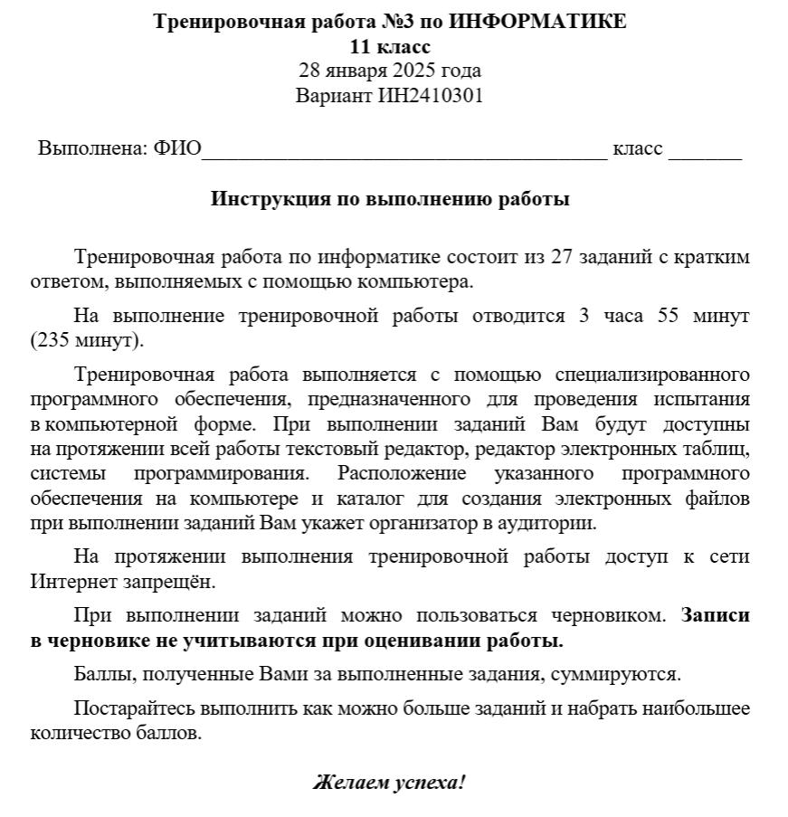 Тренировочная работа по информатике состоит из 27 заданий с кратким ответом, выполняемых с помощью компьютера. На выполнение тренировочной работы отводится 3 часа 55 минут (235 минут). Тренировочная работа выполняется с помощью специализированного программного обеспечения, предназначенного для проведения испытания в компьютерной форме. При выполнении заданий Вам будут доступны на протяжении всей работы текстовый редактор, редактор электронных таблиц, системы программирования.