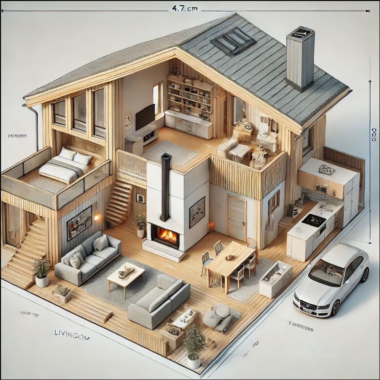 Представляем уникальный дом в скандинавско-норвежском стиле, созданный для круглогодичного проживания на даче. Этот проект сочетает в себе эстетичный дизайн, экологичные технологии и продуманную планировку, чтобы обеспечить максимальный комфорт и функциональность. Дом выполнен из натуральных материалов, что сразу придает атмосферу уюта и гармонии с природой. Фасад из обожжённой доски не только придаёт изданию выразительный внешний вид, но и обеспечивает его эксплуатацию. Благодаря технологии обжига древесина становится устойчивой к солнечному свету, грибкам и растениям, что особенно важно для круглогодичного проживания. Особенностью проекта является размещение половины дома на 1 метр относительно периметра участка, что создает интересный асимметричный силуэт и позволяет рассчитывать использование пространства. Такое решение придает индивидуальность и оригинальность, подчеркивая его современный стиль. Одним из главных идей проекта является использование утепления натуральными материалам