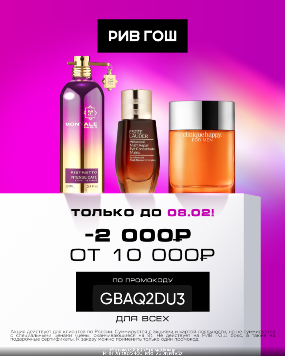 Успей совершить покупку в интернет-магазине «РИВ ГОШ» по промокоду и получи скидку 2 000 ₽ на покупку от 10 000 ₽! Акция действует для клиентов по России. Суммируется с акциями и картой лояльности, но не суммируется с специальными ценами (цены, оканчивающиеся на 9). Не действует на РИВ ГОШ бокс, а также на подарочные сертификаты. К заказу можно применить только один промокод. Есть бренды исключения, подробнее: