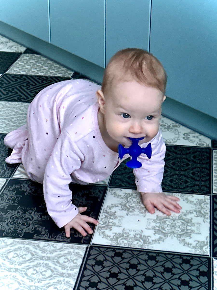 Ксюша обзавелась четырьмя зубами, и стала грызть всё подряд. Целый день ползает с чем-нибудь во рту. Вот так: