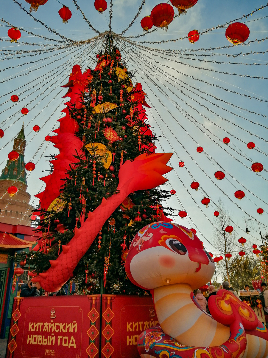 В столице вовсю проходят празднования, для этого задействовано несколько центральных площадок. Сегодня расскажу и покажу, что интересного приготовили для гостей на Манежной. Погнали! Буквально сразу же при выходе из метро посетителей встречает большой надувной дракон — один из символов китайской мифологии. Площадь поделена на несколько зон, доминантой каждой из них служит празднично украшенный шатёр с ёлкой. Помимо традиционных элементов авторы придумали посадить на ели фигуры надувных животных. Вот дракон ползёт по стволу дерева наверх. А вот панда пытается "украсть Рождество". Хотя едва ли об этом можно подумать, настолько добродушно она выглядит. Кстати, вы знали, что панды являются для китайцев символичными животными? Вообще говоря, очень много украшений сразу сосредоточено в одном месте. Ярко, красочно, нарядно. Порой даже глаза разбегаются от обилия такой пёстроты. Много тематических предметов, вееры, фонарики, маски. К празднику принарядились и зелёные красавицы, и торговые ша