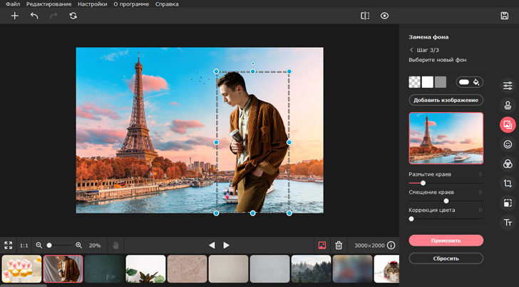Чтобы сменить фон, нажмите кнопку Добавить изображение и выберете нужную картинку (мы взяли вид на Париж). Два клика – и вот у вас уже новый фон на фото.
