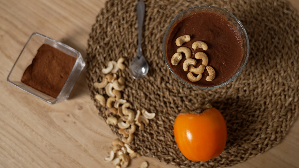 Сегодня в студии RAWMID шеф-повар Олеся Елфимова с простым, но необычным и очень вкусным рецептом шоколадного десерта. Чтобы придать определённую изюминку, в десерт добавляется хурма, а в качестве украшения и улучшения вкуса используются орехи, в данном случае это кешью. Для приготовления мы используем НОВИНКУ 2025 Мини-блендер RAWMID Dream Mini BDM-03, что делает приготовление блюд быстрым и удобным. Очистите хурму от кожуры, нарежьте на дольки, затем разрежьте их на половинки для удобства измельчения. Поместите хурму в чашу блендера RAWMID Dream Mini BDM-03, добавьте 3 ст. л какао. Включите блендер и взбивайте на 1-й скорости до получения однородной кремовой массы. Уберите в холодильник на 2-3 часа для стабилизации и достижения нужной консистенции.