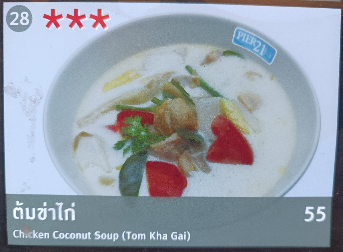После продления пребывания в Таиланде на 30 дней начинаешь ощущать, что скоро всё закончится, а хочется успеть. Итак, дегустация продолжается. Предыдущий очерк можно посмотреть здесь. Фудкорт: Куриный суп на кокосовом молоке В меню выглядят так Муляж выглядит так Готовое блюдо выглядит так Нежный практически без острого, сладкий в меру. Похоже, можно и язвенникам и детям. Для нас это блюдо также вкусно, как и Том Ям Кунг. Хотя это два совершенно разных супа. Грибной крем-суп. В меню выглядит так Готовое блюдо выглядит лучше. Нежный сливочно-грибной вкус, без остроты, не сладкий, в меру солёный. Чередование ложки супа с гренками позволяет ощутить силу вкуса от каждой ложки. Нам нравится. Решили попробовать блюда с карри и заранее спросили про остроту, нам ответили: «не остро». Мы заказали два аппетитно выглядящих блюда и попросили «no spices». Первое: рисовая лапша с рыбно-кокосовым карри соусом. В меню выглядит так На столе выглядит очень красиво Второе — рисовая лапша с южным рыбным