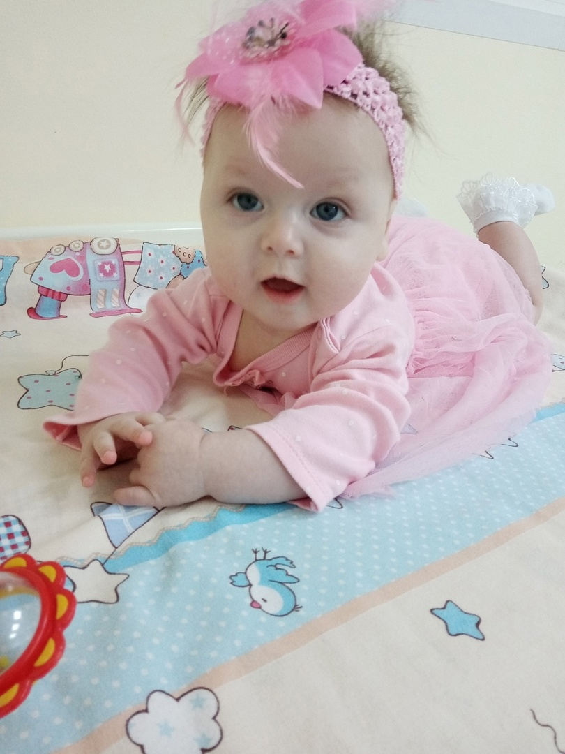 Спокойная, развивается в соответствии с фактическим возрастом. Охотно рассматривает яркие игрушки, улыбается в ответ на обращение к ней по имени. Живет по режиму ребенка младенческого возраста.