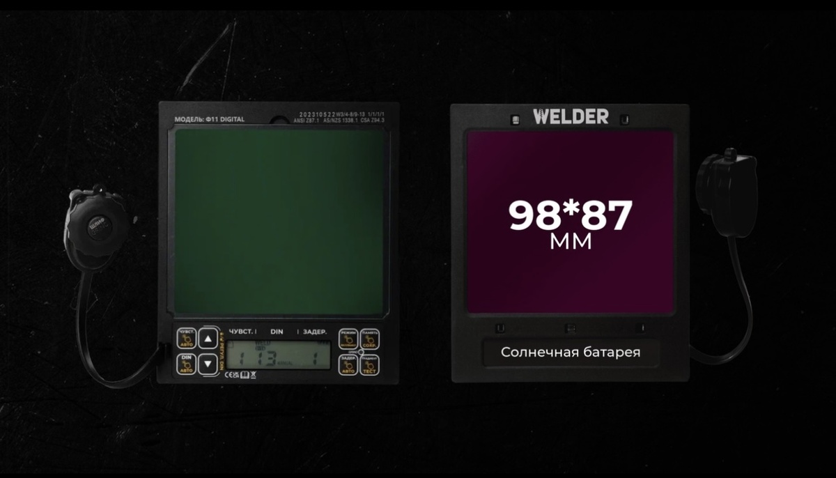 Функция «REAL COLOR» обеспечивает оптимальную защиту, а также реалистичное цветовосприятие. • Размер смотрового окна: 98*87 мм • Размер картриджа светофильтра: 133*114*10 мм Система «Хамелеон» обеспечивает автоматическое затемнение при сварке. • Уровень защиты от УФ/ИК лучей: DIN 16 • Уровень затемнения в нерабочем состоянии: DIN 3 • Уровень затемнения во время сварки: DIN 4-8/9-13 Функция «DIN LOCK» позволяет зафиксировать степень затемнения. • Режим памяти: 9 записей • Регулировка уровня затемнения: есть • Регулировка чувствительности: от 0 до 9 уровня Функция «Градиент» уменьшает усталость глаз. • Количество датчиков: 5 шт. • Сменная батарея: есть • Солнечная батарея: есть • Индикатор заряда батареи: есть Функция «Синергия» автоматическая постройка светофильтра под параметры сварки. • Режим шлифовки: есть • Оптический класс: 1/1/1/1 • Источник питания: сменная батарея Li-Ion + солнечная батарея