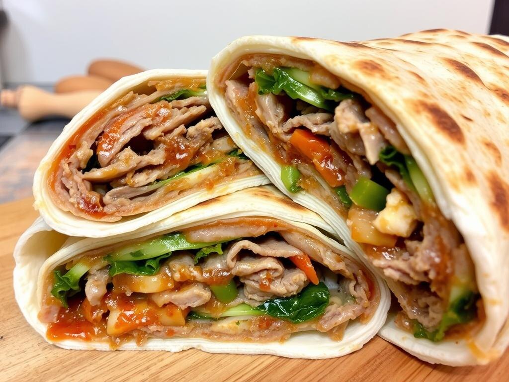Аккуратно заверните лаваш, плотно прижимая начинку. Сначала загните края лаваша внутрь, затем сверните в рулет. - Обжаривание шаурмы (по желанию):Разогрейте сухую сковороду или гриль.
