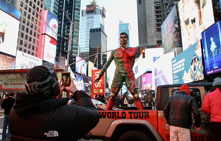 Недостаточно мемно, да? В центре Нью-Йорка установили статую Криштиану Роналду в честь его юбилея. На 40-летие легенды. Новую статую Роналду привезли на Таймс-сквер. Он золотой На площади в центральной части Манхэттена появилась бронзовая скульптуру Роналду высотой 3,6 метра – стояла на грузовике, раскрашенная в зеленый, красный и золотой цвета. Автор – скульптор Серджио Фурнари. Он же создал известный памятник «Обед на небоскребе», интерпретацию знаменитой фотографии 1932 года, где рабочие обедают на стальной балке 69-го этажа строящегося Рокфеллер-центра, выше 200 метров. «Криштиану Роналду – больше, чем просто футболист, – говорит скульптор. – Он символ упорства, совершенства и всемирного единства, которые вдохновили меня на создание этого шедевра. Я верю, что при правильной тренировке и психологической подготовке Роналду сможет выиграть ЧМ-2026. Весь континент будет ждать и болеть за тебя». Фурнари открыл статую, и болельщики Криштиану все вместе закричали Siiiiuuuuuu – фирменное п