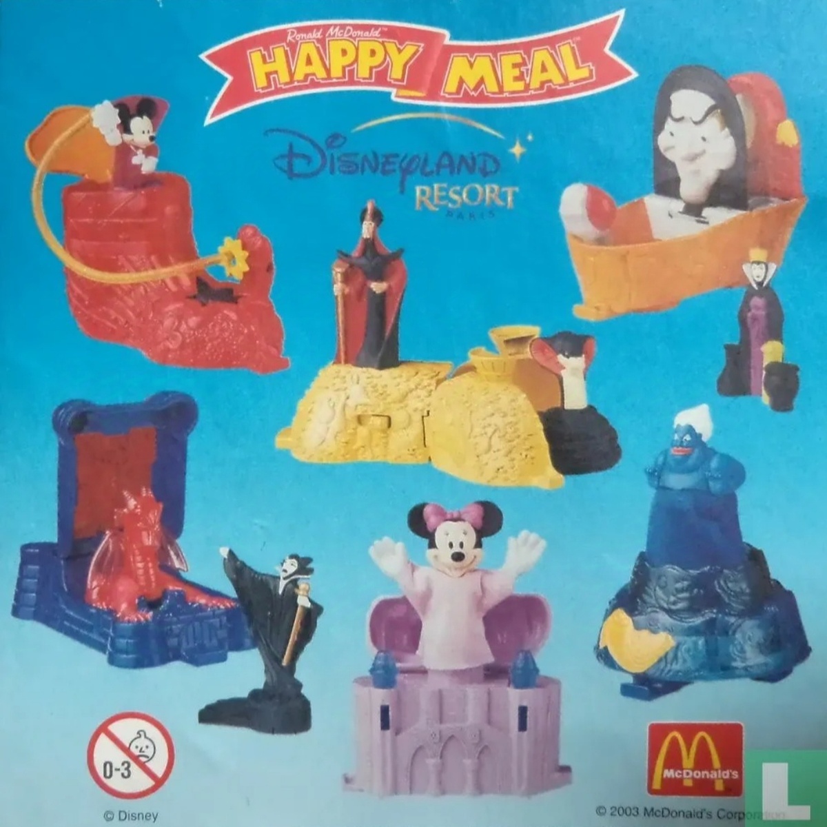 Disneyland Resort Paris 2003 — это уже третья серия фигурок, выпущенная в McDonald's посвященная Парижскому Диснейленду (ссылки на предыдущие серии в конце статьи). Данная серия связана с премьерой парада в парижском Диснейленде в 2003 году. Тут мы видим некоторых персонажей из уже полюбившихся всеми диснеевских мультфильмов: 1. Микки Маус в красном сапоге, который при нажатии на кнопку выпрыгивает из него. Также на сапоге есть фиолетовая звезда, которая светится. 2. Злая королева из мультфильма "Белоснежка и семь гномов". 3. Джафар из мультфильма "Аладдин". 4. Малефисента с драконом из мультфильма "Спящая красавица". 5. Минни Маус, которая при нажатии на кнопку выпрыгивает из замка. 6. Урсула из мультфильма "Русалочка". В моей коллекции из этой серии есть следующие игрушки: Предыдущие серии посвящённые Disneyland: Если интересуют другие игрушки из McDonald's , то переходим на Главную страницу