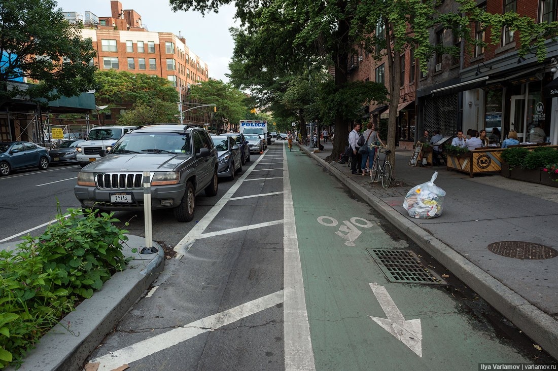 Как видите, автомобильные полосы урезаются и сужаются, зато появились выделенные полосы для автобусов и велосипедов, а одна из парковочных полос была смещена для защиты велосипедистов и подверглась озеленению. Так, например, поступили с Первой авеню. Эти меры не только снизили число аварий и увеличили количество велосипедистов на 160% (что в свою очередь улучшило экологическую обстановку), но и благотворно повлияли на местный бизнес: продажи в магазинах и кафе, расположенных в зоне "велосипедного ренессанса", резко выросли.