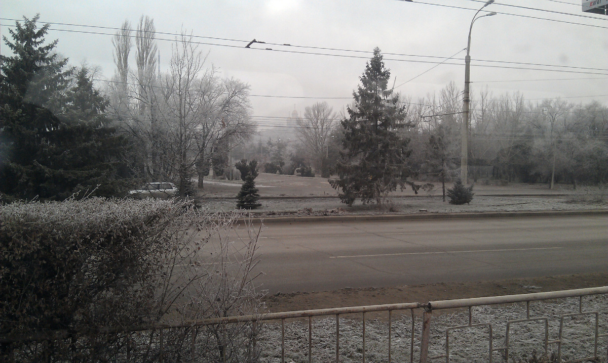 18 января 2012 года. В кадре те же места, что и на первых фото. Снимал из окна трамвая, пока ехал мимо Мамаева кургана. В городе как раз шёл сильный снег.