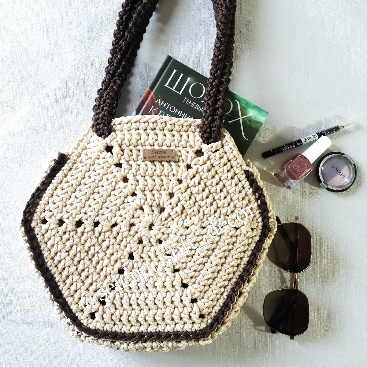 По размеру сумочка получилась 24 см.в диаметра. Длина ручки - 1.10см.