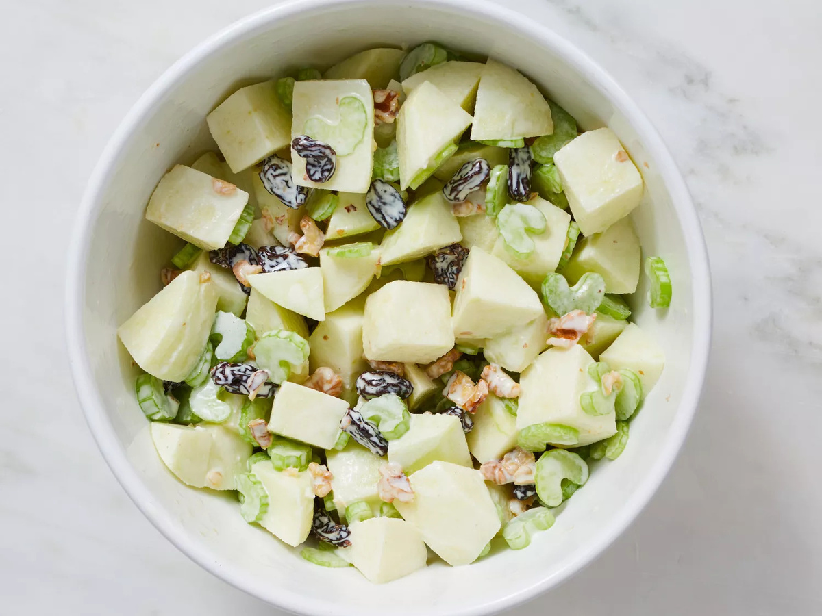 ✔ Добавьте яблоки, сельдерей, грецкие орехи и изюм. Накройте и охладите в холодильнике перед подачей.
