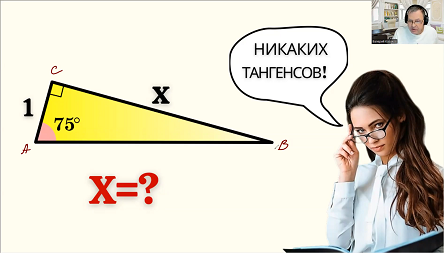 Упростим решение задачи с канала Наглядная геометрия. 1. В прямоугольном треугольнике ABC катет AC равен 1, угол A равен 75°. Вычислите длину катета BC. Ведущий канала показал сначала решение старшеклассника, знающего формулу тангенса суммы двух углов, а потом решение, доступное восьмикласснику. Вот заключительный кадр по второму способу решения. Источник. Найти второй катет без тригонометрии | Наглядная геометрия. https://dzen.ru/video/watch/67a5cb0dede0fc13781c328e Мы лишь несколько сократим решение, доступное восьмикласснику. Решение. Отложим катет AC на его продолжении за точку C, CD = AB = 1, построим отрезок DB и высоту DH треугольника ABD. Мы обошлись без свойства медианы прямоугольного треугольника и второй буквы, которые были применены в авторском решении.