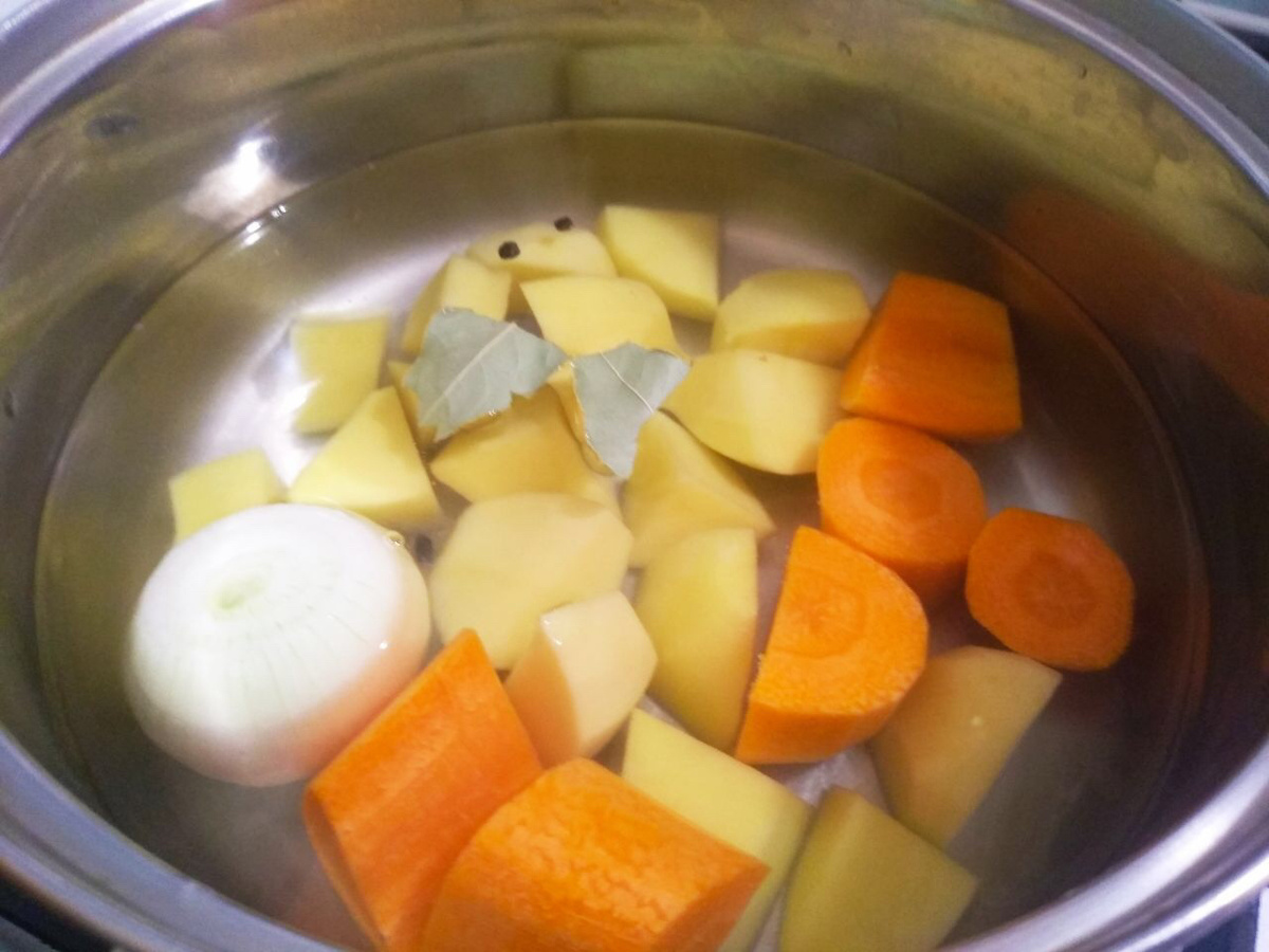 Сварим овощной бульон.Очищенные овощи: картофель, морковь, 1 луковицу, заливаем 1 литром воды, солим, добавляем лавровый лист и перец, и ставим на плиту вариться до готовности.