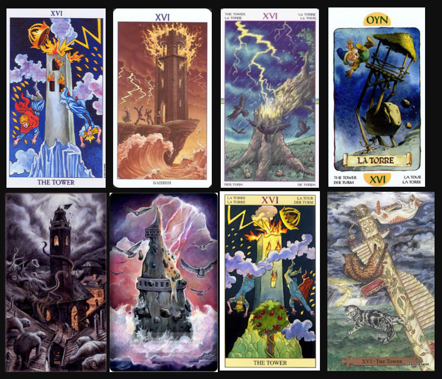 От стен башни отваливаются части. Сами стены представляют собой панцирь, футляр, которым человек скрывал себя от мира (и мир от себя). Внутри стен - огромный потенциал, снаружи - мир, ждущий его раскрытия. Единственное препятствие - стены. Они начинают разрушаться, у кого-то отвалится одно за другим, у кого-то сразу все, у кого-то будут спадать массивные камни, у кого-то проще, как пленка отходит. Знаете, какая ассоциация? - когда пластырь от ноги отлепляешь, у кого-то зацепится за волосы и кожу, а у кого-то отойдет быстро. Но ощущения неприятные, болезненно-пощипывающие, остро-ноющие, будут у всех.