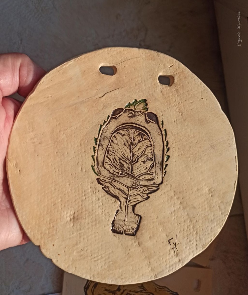 Мои читатели, конечно, знают, что я увлечён не только деревом, но и глиной. Сегодня я покажу вам несколько своих новых керамических работ с пылу с жару, как говорится. Только вынул их из печи и сделал снимки. Это рельефная гравюра на керамике, каждая пластинка выполнена и покрашена вручную. Ну что же, садитесь поудобнее, начинаём наш небольшой обзор. Номер один. Это одна из популярных моих тем "Медитация - погружение в лист". Люблю этого лягушонка: Под номером два у нас сегодня новинка. Да-да, я придумал ещё одного лиса и назвал его "Доставщик груш" Номер три. в продолжение грушевой темы) "Жёлтая груша", один из любимых моих фруктов, как в художественном, так и в пищевом смыслах: Номер четыре. "Ветер странствий" - широко известная версия доброго лиса-путешественника. Предыдущий вариант лопнул при обжиге, пришлось делать заново: И завершает наш сегодняшний обзор номер пять - диковинная "Рыба Сальвадор", прошу любить и жаловать: Все вышепоказанные пластины предназначены для оформления