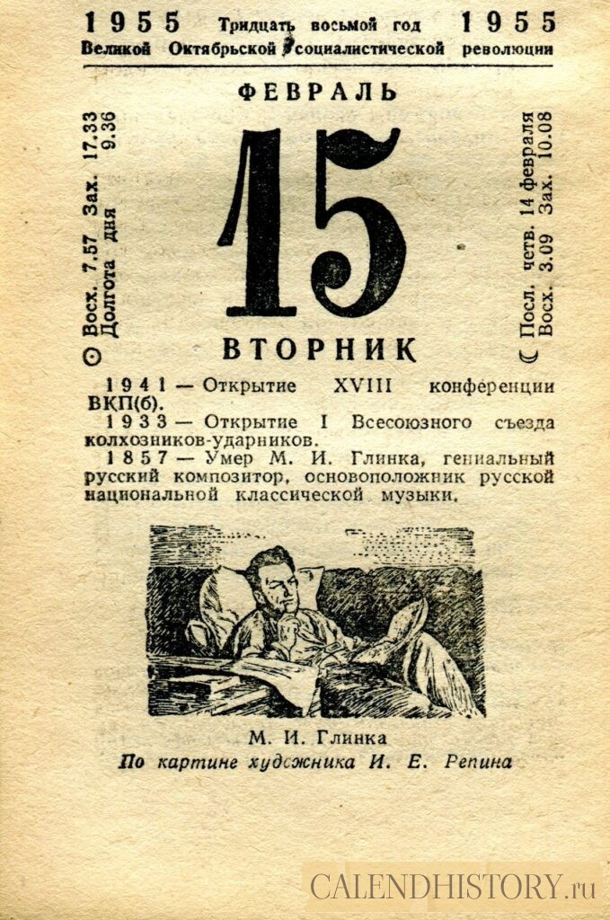 Итак, сегодня 15-го февраля и у нас на календаре 1955-й год. Перед нами листок советского календаря Политиздата. На календаре у нас вторник - 15 февраля 1955-го года. М. И. Глинка