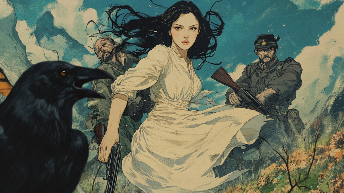 Иллюстрация показывает, как женщина в светлом платье бежит от навязчивых образов: таинственного мужчины, похожего на джинна или индейца, солдата с ружьём и зловещего господина в плаще и шляпе. Чёрный ворон на переднем плане усиливает атмосферу зловещих предчувствий. Но самая важная деталь — это своеобразная «рамка», создающая эффект, будто мы наблюдаем сцену из комикса или сна. В контексте стихии Воздуха (мыслей) она указывает: всё происходящее может быть лишь плодом воображения, внутренней драмы, а не реальностью.
