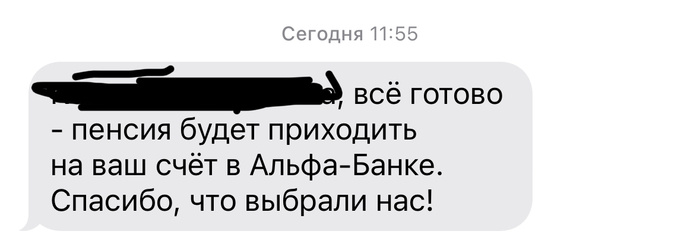 Мне 33, до пенсии конечно рановато, ситуация произошла такая. Я клиент альфа банка с 2011 года, были красные флаги, но этот момент выбесил. 12.02 я посетила отделение для получения ранее заказанного мной стикера. При заказе стикера нигде не указывалось, что он имеет овердрафт. Ладно фиг с ним, я попросила сотрудника убрать эту услугу. Сегодня утром просыпаюсь и вижу смс от альфа банка.