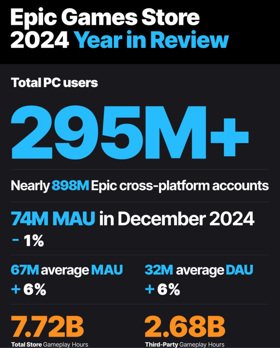 2024 год стал для Epic Games Store значимым этапом развития, о чем свидетельствуют опубликованные статистические данные. Количество зарегистрированных пользователей магазина на ПК достигло 295 миллионов, что на 25 миллионов больше, чем годом ранее. Весьма впечатляющий рост наблюдается и во всей экосистеме Epic Games — суммарное число учетных записей на различных платформах достигло 898 миллионов.