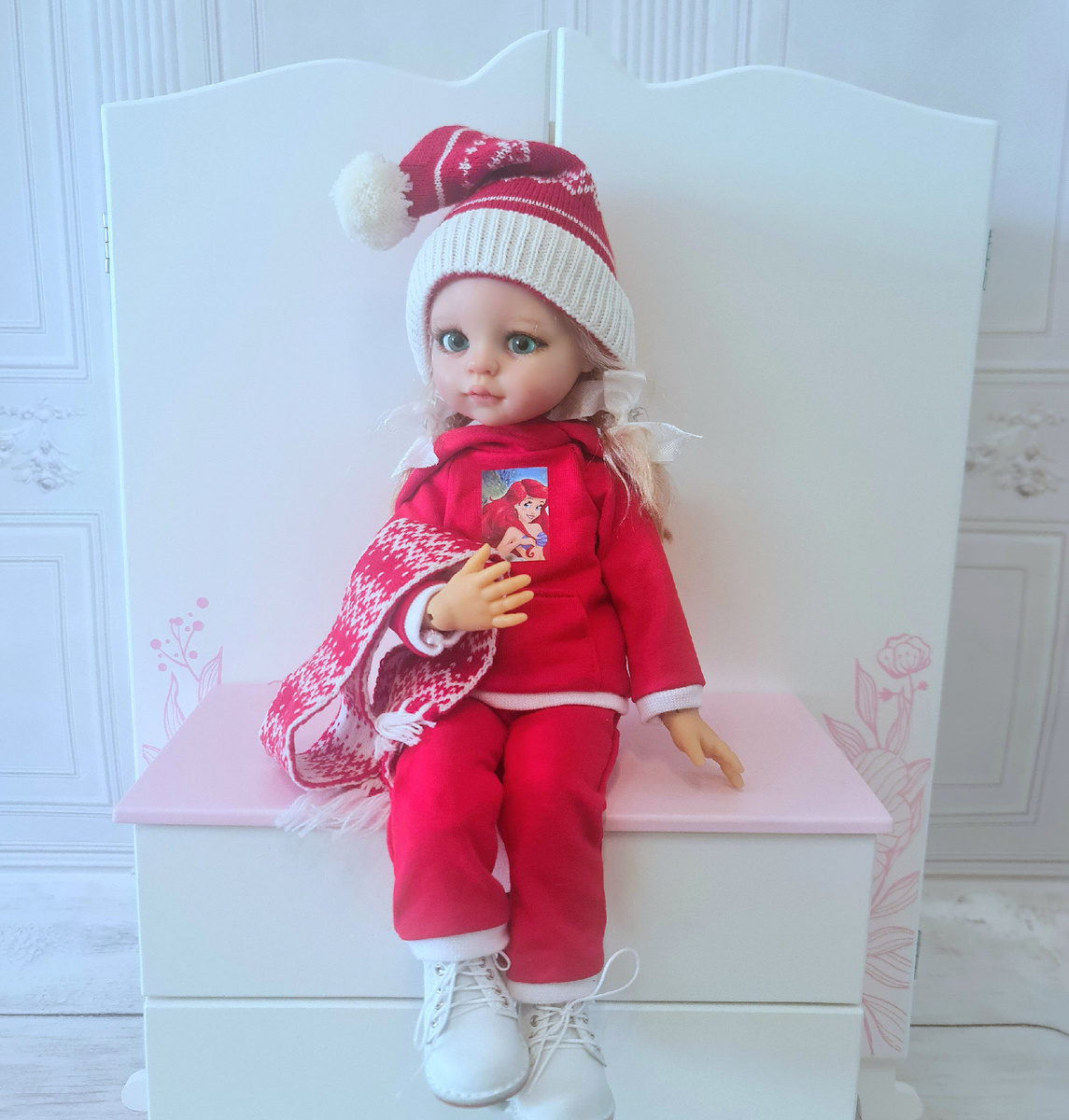 Привет! Соскучились? Мы - да! А вот Марьяша никак попутала чего-то. Или кто-то её попутал? Нарядилась в новогодний колпак и сидит хитрющая. -Вообще-то февраль-месяц, скоро лето, а у тебя всё ещё Новый год? Все праздники давно прошли. -Так и у тебя Новый год - вон ёлка всё ещё на балконе стоит в фонариках. -Она у нас до самой весны стоять будет, она искусственная, а с фонариками веселее (пишите в комментариях, у кого так же, ведь я же не одна такая, правда?). А ты, Марьяша, меньше умничай и давай скорее красоту покажем, которую нам на праздники надарили и не только, нам есть о чём рассказать. Собирались мы на каникулах вот такой маленькой "компанией по интересам" поболтать, чайку попить и подарочками обменяться. Себя развлекли, кукол показали. Ну, или себя показали и кукол развлекли - кому как нравится. Покажем что же нам подарили. Вот такое платьице, почти винтажное. Марьяша в нём на матрёшку похожа... Кстати, где наши все остальные "матрёшки"? Надо бы и их позвать. -Нет, обойдутся,