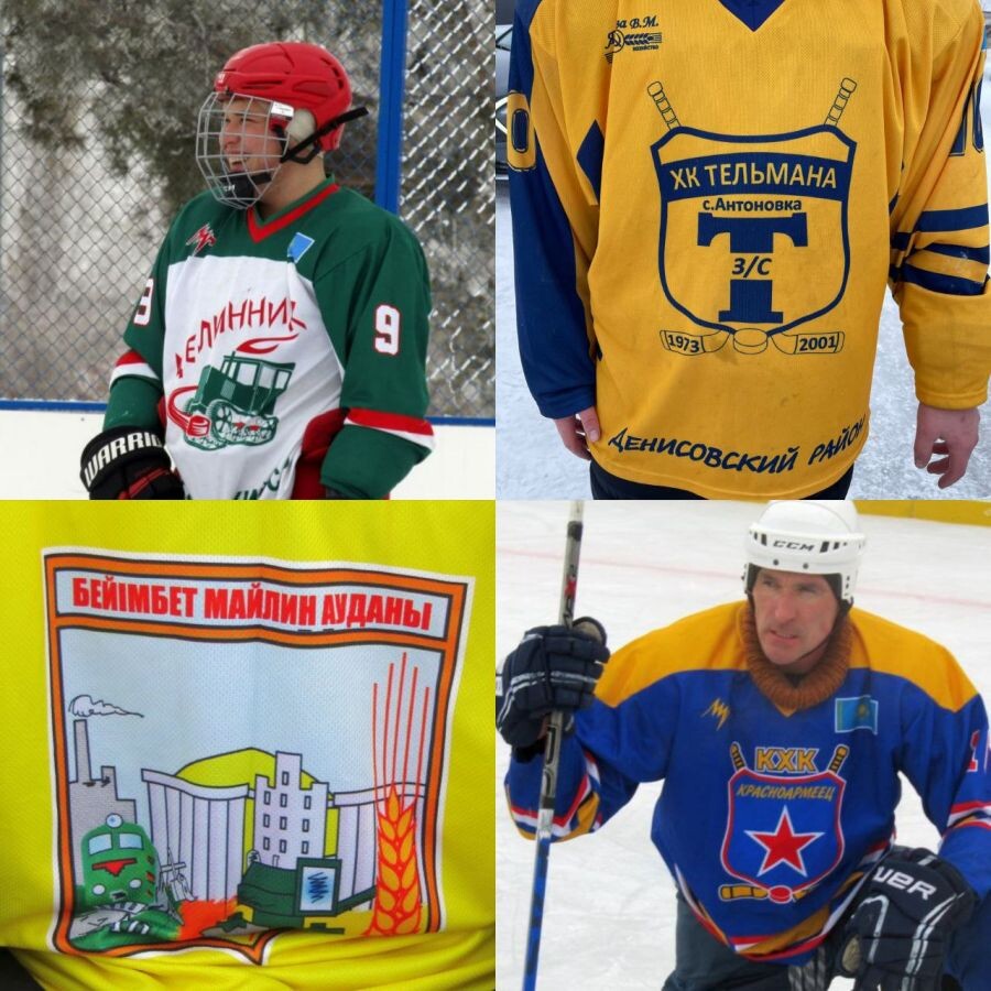 Как я уже писал в предыдущем тексте, я давно хотел посетить матчи ДХЛ (Денисовской хоккейной лиги). Даже не столько из-за экзотичности географии или уровня игры, а потому, что, на мой взгляд, это любительский турнир с самой красивой формой. Стильный герб и шрифт на желтых свитерах ХК «Тельмана», красная звезда с клюшками на желто-синей форме «Красноармейца», прекрасный в своей эксцентричности герб ХК «Район Бейимбета Майлина» (тепловоз, комбайн, элеватор и встающее над всем этим гигантское солнце), ну и, конечно, обожаемый мной зеленый трактор с красной шайбой у «Целинника».