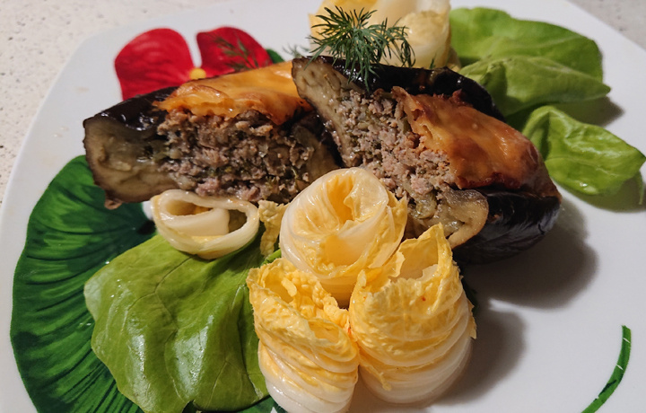 ✔ Фарш из бедра куриного – 400 г; ✔ Лук репчатый – 1 шт.; ✔ Укроп – 20 г; ✔ Специи для курицы, соль - по вкусу; ✔ Баклажан - 2 шт.; ✔ Сыр тёртый - 100 г; Гарнир: ✔ Салат масляный - листик; ✔ Капуста пекинская квашеная - 2-3 листика; ✔ Масло растительное нерафинированное - 1 ч. л. Баклажан вымыть, плодоножку оставить. Наколоть ножом в нескольких местах, можно отправить в духовку на 15 минут при температуре 190 градусов, а можно в микроволновой печи под колпаком минут на 10, чтобы баклажаны стали мягче и их удобно было фаршировать. У меня фарш - из филе куриного бедра с добавлением лука и специй. Достать обработанные баклажаны из духовки, сделать надрез от плодоножки к основанию, сделать кармашек. Мякоть из баклажана не вынимаю. Посолить, наполнить фаршем, смазать верх томатным соусом и отправить в духовку на 30 минут при температуре 190 градусов. Затем посыпать сыром, и ещё 5-7 минут, до румяной корочки. На гарнир у меня - лист масляного салата и несколько листочков квашеной пекинской к