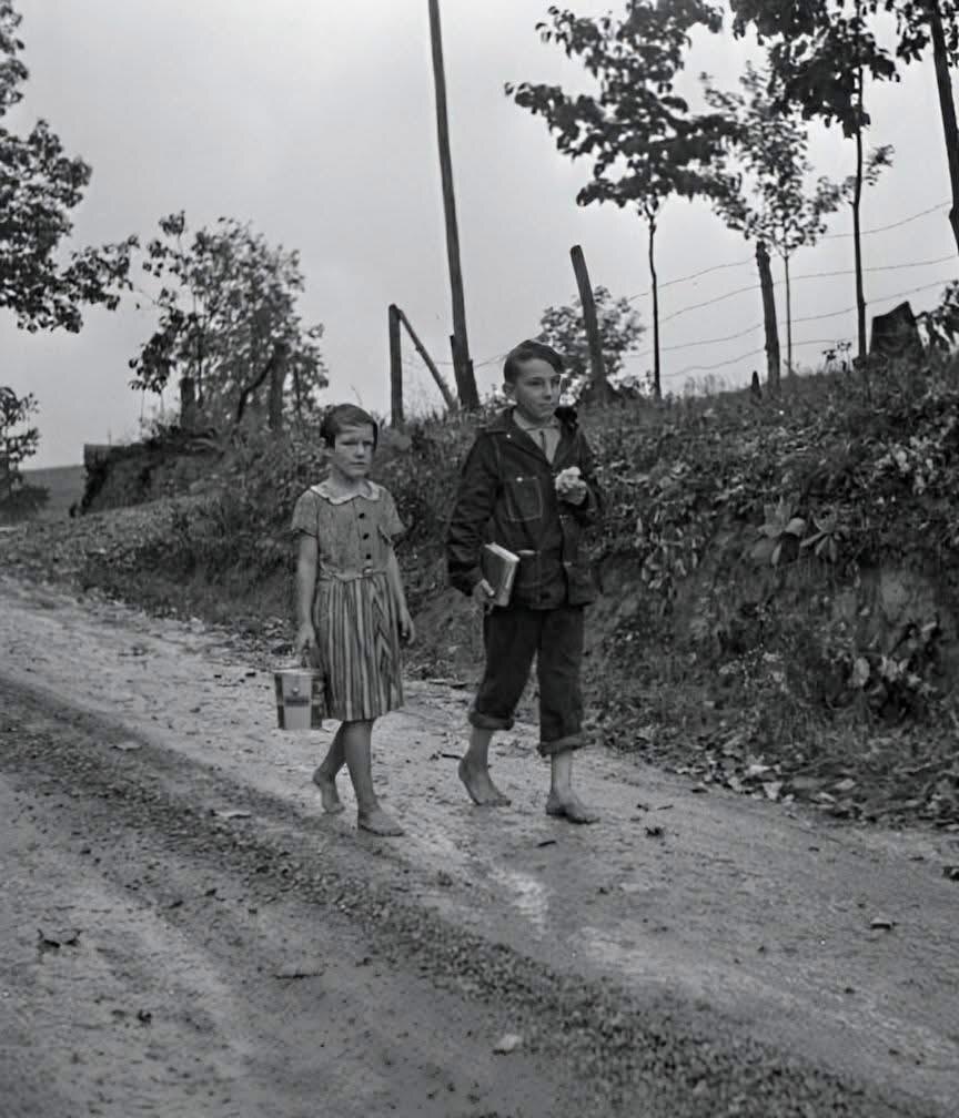 Двое детей из Теннесси идут босиком в школу. 1940 г., США