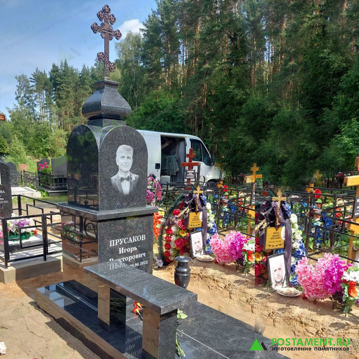 Специалисты компании «Постамент» завершили работы по обустройству небольшого захоронения на Анкудиновском кладбище. Элитный комплекс из габбро-диабаза состоит из: Центральным элементом композиции является величественный памятник-Голгофа, символизирующий священный холм и напоминающий о жертве и искуплении. На вершине памятника расположен узорный чугунный крест, словно выросший из гранитного основания, символизирующий веру и надежду на возрождение и вечную жизнь. Тщательно обработанный черный гранит, сдержанный и благородный, подчеркивает монументальность сооружения. Строгие, монументальные формы памятника гармонично сочетаются с плавными узорными линиями креста, создавая ауру покоя и сосредоточенности. На лицевой стороне памятника расположена гравировка портрета, выполненная на гравировальном станке с ЧПУ. Надписи созданы пескоструйным аппаратом и покрашены белой акриловой краской, предназначенной для гранита. Памятник-Голгофа – не просто надгробие, а художественное высказывание, вопл