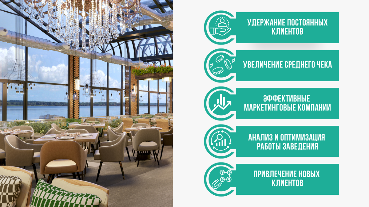 1. Удержание постоянных клиентов Исследования показывают, что привлечь нового клиента стоит в 5-7 раз дороже, чем удержать существующего. CRM помогает анализировать, кто из гостей давно не посещал ваше заведение, и отправлять им персонализированные предложения, чтобы вернуть их. Например: 2. Увеличение среднего чека CRM-система может использовать данные о предпочтениях клиентов, чтобы предлагать им то, что их заинтересует. Например: 3. Эффективные маркетинговые кампании CRM позволяет создавать целевые рекламные кампании. Например: Точный таргетинг помогает повысить отклик гостей и сократить расходы на неэффективные маркетинговые инструменты. 4. Анализ и оптимизация работы заведения CRM-система собирает статистику о работе вашего заведения: На основании этих данных вы можете оптимизировать меню, предлагать гостям подходящие блюда, увеличивать продажи в непопулярные часы (например, через "счастливые часы" или обеденные скидки) и снижать расходы на малоприбыльные направления. 5. Привлечен