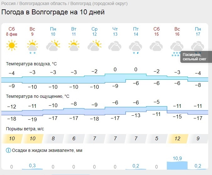 По данным сервиса Gismeteo, сильный снег придет в Волгоград не раньше будущего воскресенья, 16 февраля. Дневная температура воздуха составит при этом до -3 градусов мороза, а ночная – до -16. Ощущаться такие отметки будут как минимум -15 градусов мороза! Синоптики прогнозируют, что на город в эти сутки обрушится сразу 10,9 миллиметров осадков. Завтра в городе ожидается небольшой снег, а в пятницу, 14 февраля, небольшой, мокрый снег. А пока, перед порцией снега, нам предстоит испытать на себе мощную погодную морозилку. Стоит отметить, что в волгоградском ЦГМС обновили данные по морозным отметкам на эти выходные. Так, в ближайшую ночь, ночь на 9 февраля, столбики термометров по области при прояснении будут опускаться до значений -12 - -17 градусов мороза. В целом на всей территории области ожидается до -11. А также – без осадков, гололедица и местами порывы северо-восточного ветра до 14 м/с. В ночь на понедельник жители области переживут отметку -16, небольшой снег и ветер с порывами до