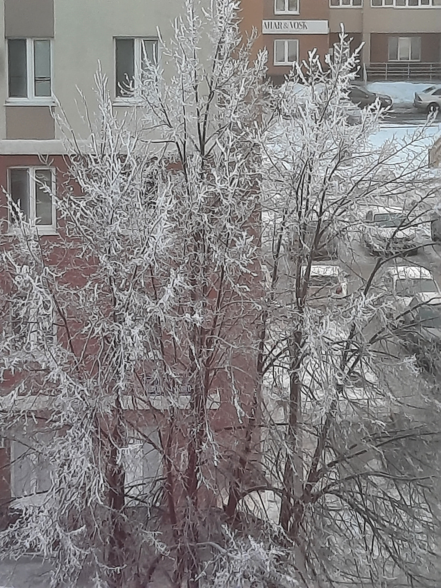 На улице мороз. Правда, мы ещё не выходили, но по народным приметам, дым из труб завода подымается прямо вертикально в небо, иней на деревьях указывают, что зимушка зима гуляет по городу.