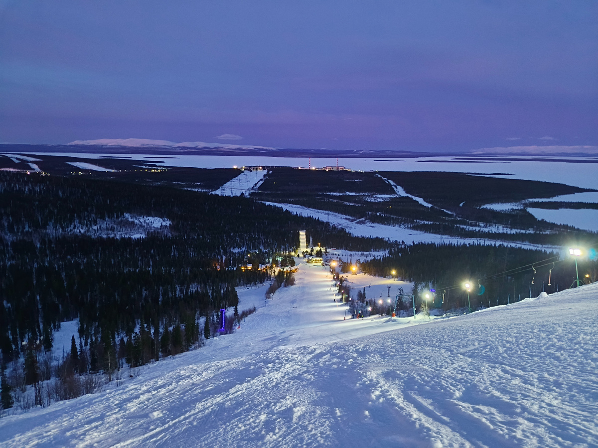 Всем привет. О плюсах жизни за Полярным кругом. Минусов, конечно, не мало, но как-нибудь в следующий раз. Вечер пятницы, время когда можно пожить для души. Просто ничего не делать и не сожалеть об этом. К примеру, погонять в приставку игровую, посмотреть кино, музыку послушать. А почему бы, думаю, на горе не покататься? Тем более с этой недели подъёмник стал до семи часов вечера работать. Утром загрузил в машину сноуборд, ботинки, куртку, штаны и пр. А на работу пошёл как обычно, т.к. хождение в спортивной одежде не приветствуется от слова "совсем". Необходимо создавать солидный вид и строить умное лицо с горящими глазами. В пять часов, по пути домой заехал на гору. Скинул брюки и рубашку с ботинками. Одел сбрую сноубордическую. Тут же мир вокруг перевернулся. Появились яркие краски заката, бегущие огни дороги где-то внизу, белый склон под доской. Многие спросят: - Ну и что в этом такого? В чём смысл твоего повествования? Всё дело как обычно в нюансах. Кроме меня на подъёмнике никог