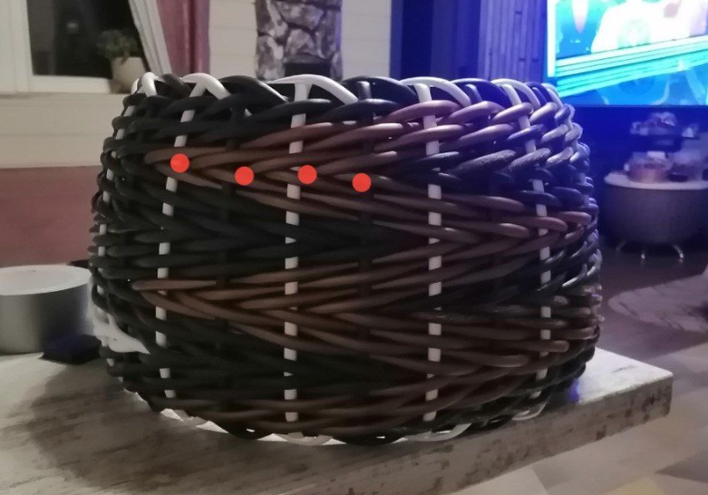 Вот не дает мне покоя этот цилиндр, вроде сплела, другими делами занялась, ан нет, нужно еще одну ошибку исправить. Мне на нее указала моя тезка из Телеграма, с которой общалась вчера вечером. Она увидела мое кашпо и написала, что там рисунок неправильно уложен: По поводу Африки я имела ввиду не само плетение, а когда обрезки укладывают. В углах лоза должна в одном направлении ложится, иначе рисунок выбивается из общего видения, это как коса. Если лоза, выходящая из угла, лежит сверху второй, а в последующем наоборот, то рисунок теряется И в качестве иллюстрации приложила вот это фото: Вот ведь глазастая :-) У меня действительно кое-где рисунок был уложен неправильно. Я девушка не ленивая, мне вязать-распускать, шить-пороть, плести-переплетать не впервой, так что без проблем все исправила. И решила сравнить, что получилось в итоге. Вот здесь я исправила свой первый косяк. Выплела из середины черную полоску и вставила античную бронзу. Стало поровнее и даже посимпатичнее, хотя тоже не оч