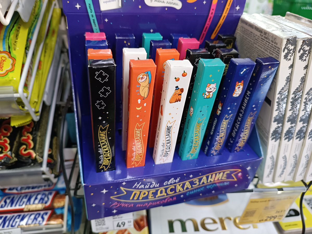 Начну сегодня с товаров возле кассы, тут девочки подсказали обратить внимание на коробочку с ручками. Подарочные разных цветов с предсказаниями.