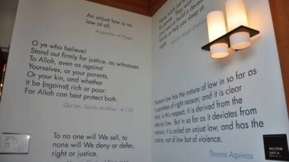 Гарвардская школа права (Harvard Law School), одно из самых престижных учебных заведений в юридической сфере, разместила у входа в свою библиотеку аят Священного Корана, характеризуя его как одно из величайших выражений справедливости в истории, сообщает сайт thedeenshow.com. Аят 135 из суры “Ан-Ниса” (“Женщины”) был вывешен на стене у главного входа на факультет, посвященной лучшим фразам, выражающим справедливость: О те, которые уверовали! Свидетельствуя перед Аллахом, отстаивайте справедливость, если даже свидетельство будет против вас самих, или против родителей, или против близких родственников. Будет ли он богатым или бедным, Аллах ближе к ним обоим. Не потакайте желаниям, чтобы не отступить от справедливости. Если же вы скривите или уклонитесь, то ведь Аллах ведает о том, что вы совершаете”. По данным издания Saudi Daily, студент из Саудовской Аравии, который учится в Гарварде, впервые обратил внимание на этот аят и опубликовал фотографию с ним на своей странице в Twitter. Поче