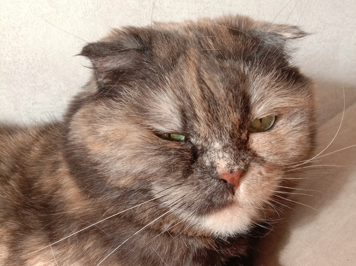 Буся вот у нас дама возраста почтенного. Практически целыми днями спит, на большие высоты уже не рискует запрыгивать – зовёт нас, чтобы помогли ей куда надо забраться.