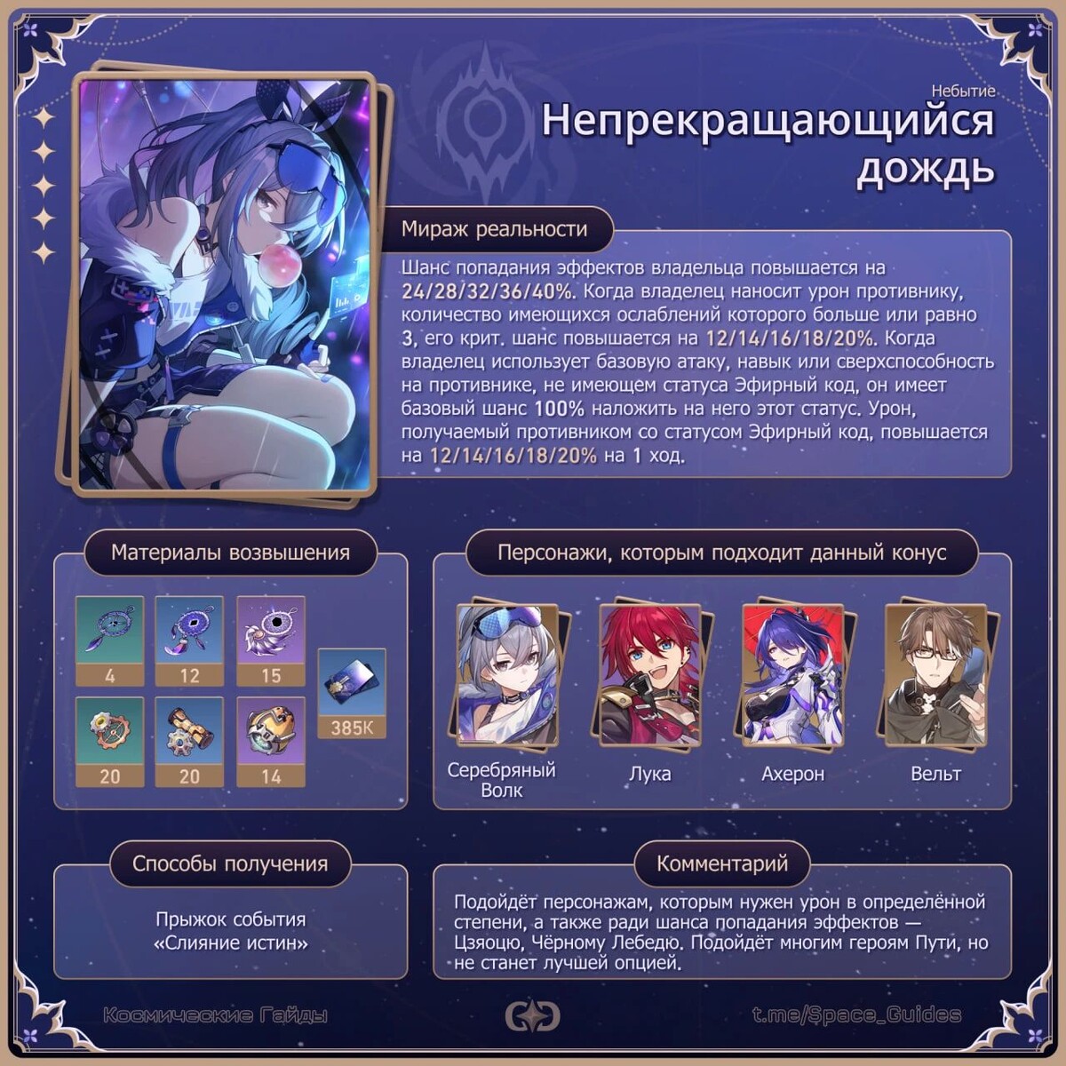 ㅤ«Непрекращающийся дождь» — сигнатурный Световой конус Серебряного Волка. Этот персонаж специализируется на наложении множества дебаффов, включая дополнительную уязвимость с навыка, совпадающую с элементом персонажа из отряда. Насколько этот конус важен для Волка и может ли он быть полезен другим персонажам Пути Небытия?