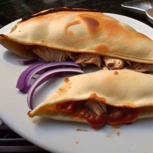 - 1/2 чашки нарезанного красного лука Для начала разогрейте духовку до 425°F. Раскатайте тесто для пиццы в большой круг и положите его на лист для выпечки. Распределите соус барбекю по тесту, оставив по краям 1-дюймовую границу. Добавьте измельченную курицу, сыр моцарелла и нарезанный красный лук поверх соуса барбекю. Сложите тесто поверх начинки и защепите края для уплотнения. Сделайте ножом несколько прорезей в верхней части кальцоне, чтобы выходил пар. Выпекайте кальцоне в тече