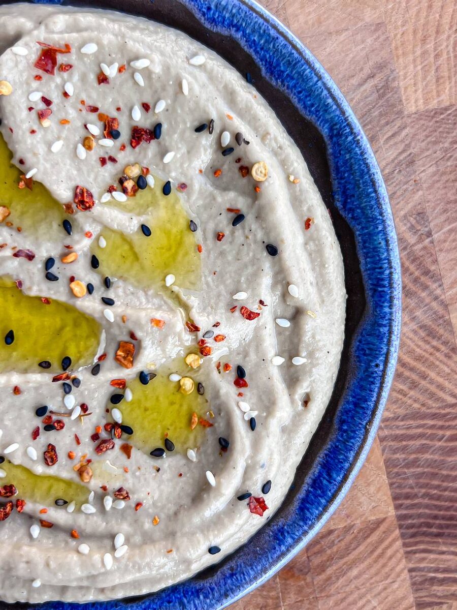- Выложите баба гануш в тарелку, сбрызните оливковым маслом, посыпьте кунжутом, хлопьями чили, зеленью или чем угодно еще.