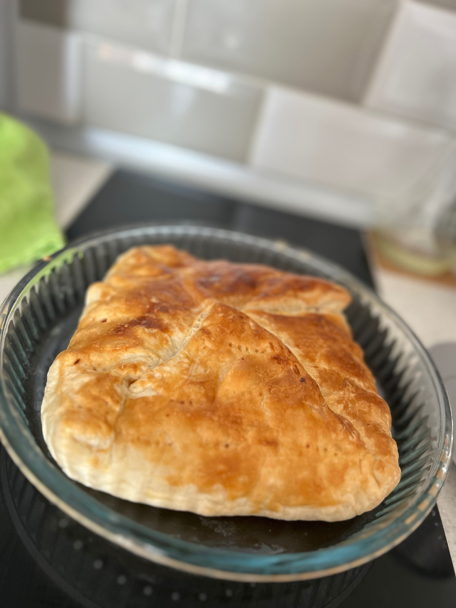 Когда совсем нет времени готовить, но хочется чего-то вкусного к чаю, попробуйте приготовить этот пирог из слоёного бездрожжевого теста. Тесто вытаскиваем из морозилки размораживаться. В одной упаковке два пласта, я использую для пирога только один, но когда хочется больше, готовлю из двух. Пока тесто размораживается, приготовим начинку. Для неё возьмём колбасу ( у меня варёная докторская), сыр (у меня голландский) и солёные огурцы ( у меня покупные корнишоны). Набор и разновидность начинки может быть абсолютной разной, в зависимости от того, что Вы любите. Нарезаем продукты маленькими кубиками в глубокую тарелку, добавляем немного специй и кетчуп, перемешиваем. Солить не рекомендую, потому что все ингредиенты для начинки солёные. Когда тесто разморозилось, раскатываем его не сильно тонко и переносим на форму для запекания так, чтобы края теста были на стенках формы. В неё равномерно, без горок, накладываем начинку и закрываем концами теста внахлест. Если начинку бу