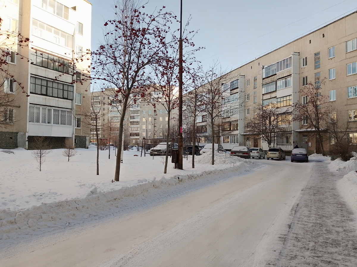 Поела глазунью с гречкой и пошла в магазин. По пути сфотографировала дома, дворы.